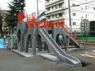 3年前の台風で壊れ、撤去された赤羽公園のキリンの滑り台は、現在復元工事がおこなわれています。 すでに基礎の部分ができあがり、あとは色を塗るだけになっていました。年度内には完成の予定です。 以前の滑り台 …