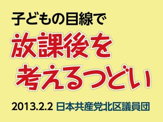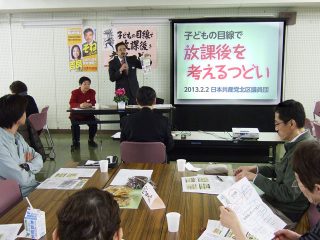 日本共産党北区議員団が主催する「子どもの目線で放課後を考えるつどい」が、岸町ふれあい館で開かれました。 北区ではこの4月から、子どもをめぐる環境が大きく変化します。 放課後子どもプラン、学童クラブ、児 …