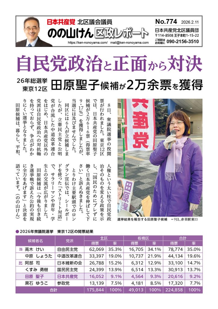 自民党政治と正面から対決 26年総選挙 東京12区 田原聖子候補が2万余票を獲得