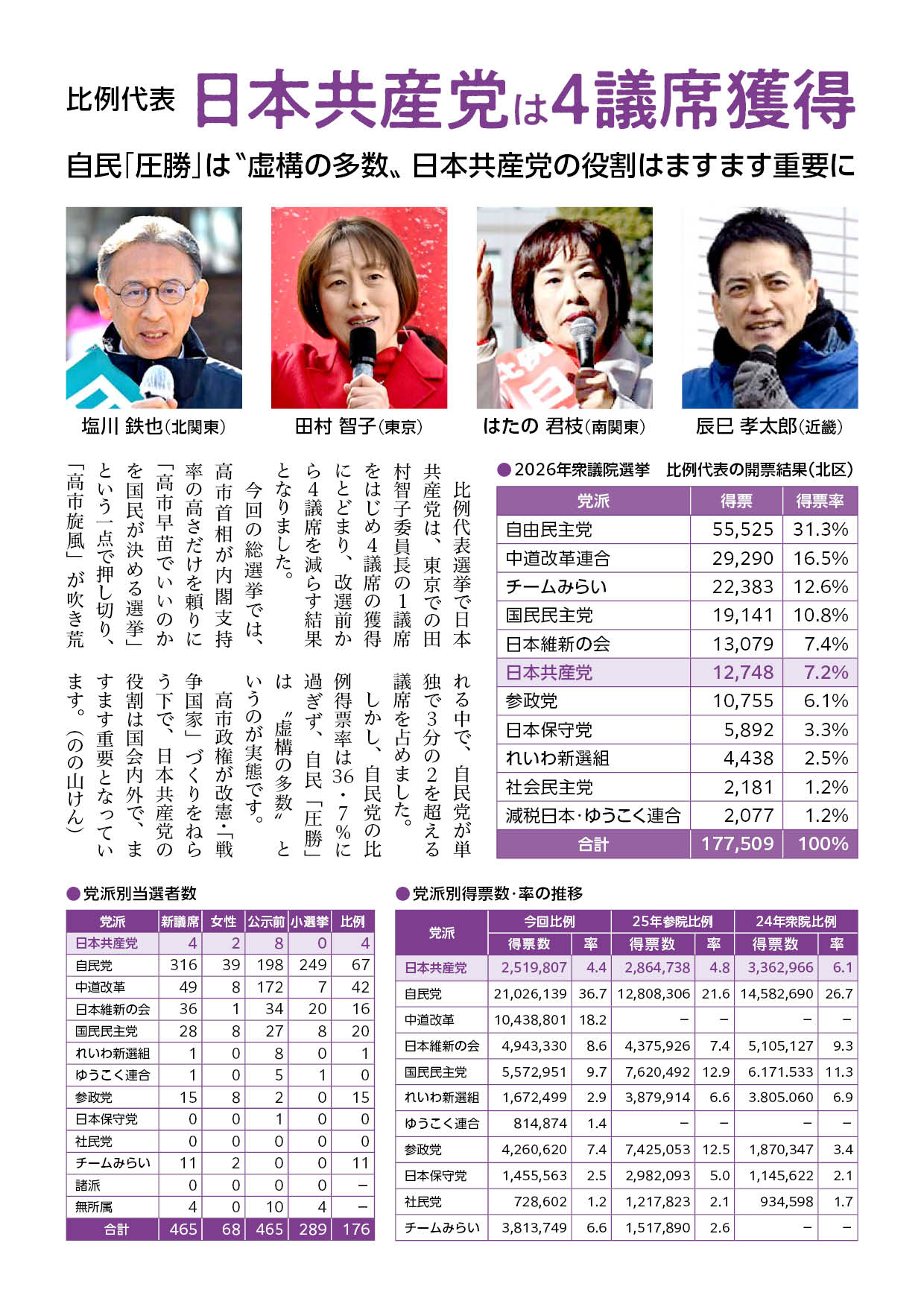 比例代表 日本共産党は4議席獲得 自民「圧勝」は〝虚構の多数〟 日本共産党の役割はますます重要に