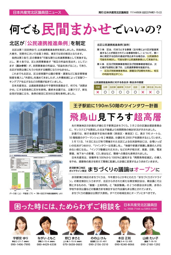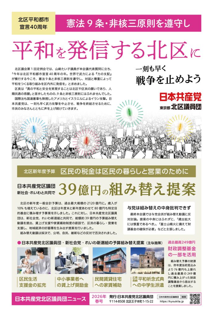 3 月25 日に終了した北区議会第1 回定例会での論戦を紹介する日本共産党北区議員団ニュース春号ができました。