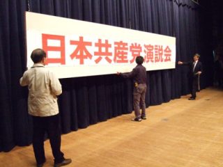 赤羽会館で日本共産党演説会を開きました。 舞台裏では午後6時前から要員のみなさんが集まり、準備がすすめられました。 昨今は大型インクジェットプリンターも駆使して、正面看板も自前で印刷します。 夕方には …