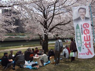 岩淵小学校の入学式が終わったその足で、日本共産党志茂・赤羽後援会のお花見にかけつけました。 自宅からすぐの岩淵橋を渡り、新河岸川沿いの土手を北上すると、ビニールシートを敷いて陣取った一群が見えてきまし …
