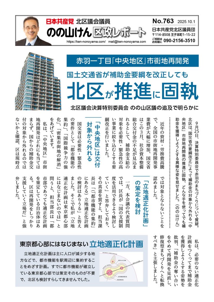 - 赤羽一丁目「中央地区」市街地再開発 国土交通省が補助金要綱を改正しても、北区が推進に固執 北区議会決算特別委員会 のの山区議の追及で明らかに