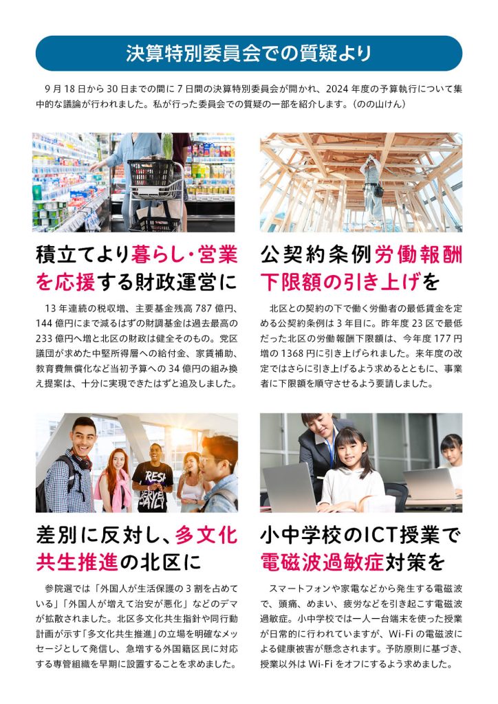 - 決算特別委員会での質疑より 積立てより暮らし・営業を応援する財政運営に/公契約条例労働報酬下限額の引き上げを/差別に反対し、多文化共生推進の北区に/小中学校のICT授業で電磁波過敏症対策を