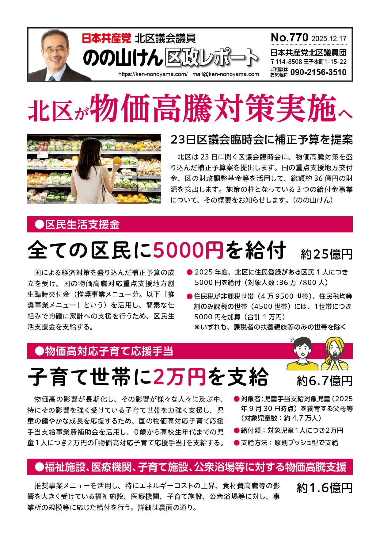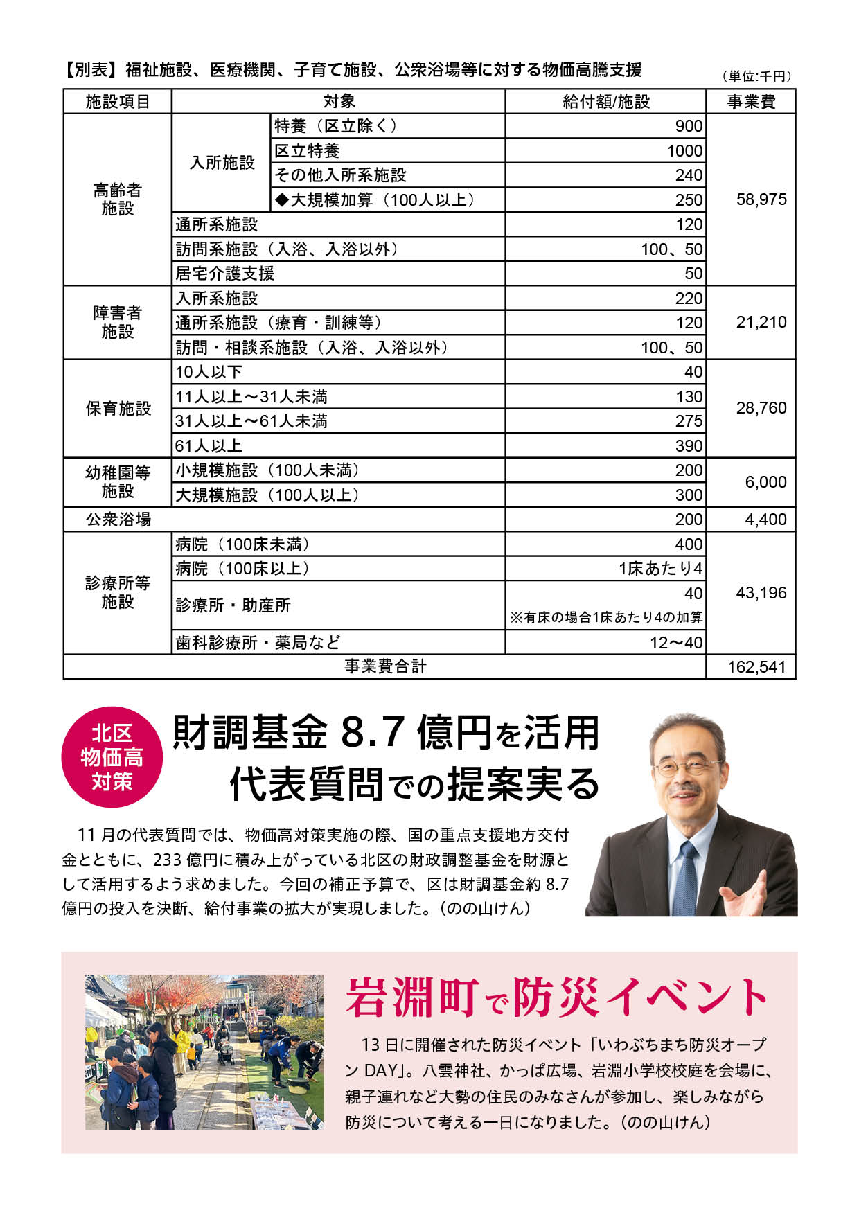 北区物価高対策 財調基金8.7 億円を活用 代表質問での提案実る