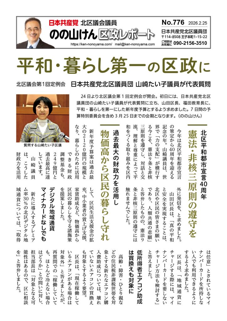 平和・暮らし第一の区政に 北区議会第1回定例会 日本共産党北区議員団 山崎たい子議員が代表質問
